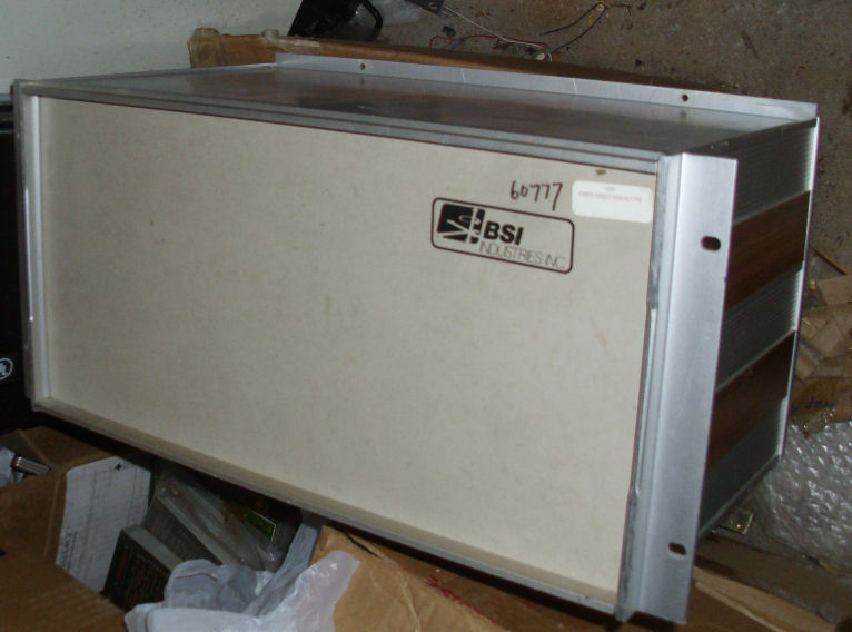 small rackmount chassis BSI Industries branded, aluminum; 20 pounds with power supply, 17 X 10 X 9 plus two rack-mount brackets empty space inside ex/ transformer, caps, rectifier. , top panel slides out.